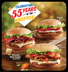 The new, commemorative WHOPPER® 55th Anniversary menu items are available for a limited-time-only at participating BK® restaurants nationwide. So stop by a local BURGER KING® restaurant to sample the new menu items and join in the celebration of AMERICA’S FAVORITE BURGERTM. ABOUT BURGER KING WORLDWIDEFounded in 1954, BURGER KING® (NYSE: BKW) is the second largest fast food hamburger chain in the world. The original HOME OF THE WHOPPER®, the BURGER KING® system operates in over 12,600 locations serving over 11 million guests daily in 86 countries and territories worldwide. Approximately 94 percent of BURGER KING® restaurants are owned and operated by independent franchisees, many of them family-owned operations that have been in business for decades. To learn more about Burger King Worldwide, please visit the company's website at www.bk.com or follow us on Facebook and Twitter.
